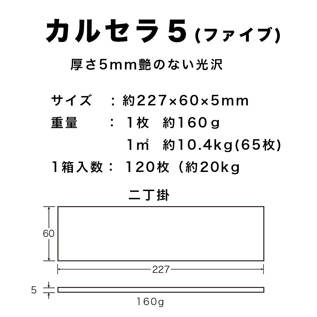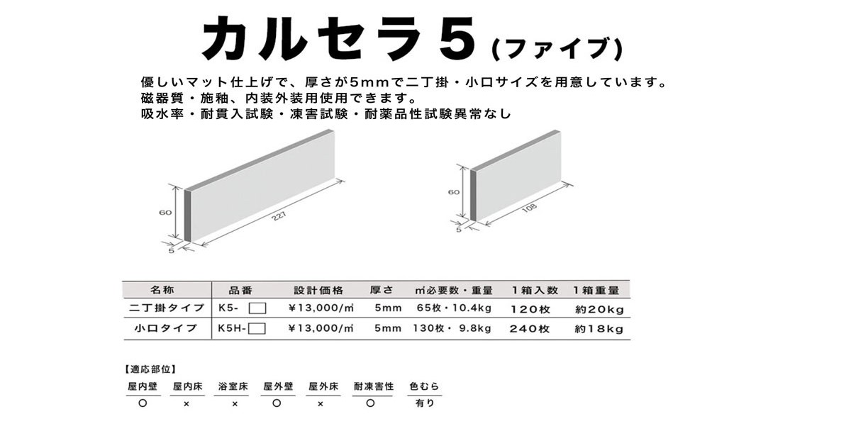 厚さ5mmにすることで二丁掛、小口平ともに約10kg/m2を実現。従来に比べ50%以上の軽量化を実現しました。
